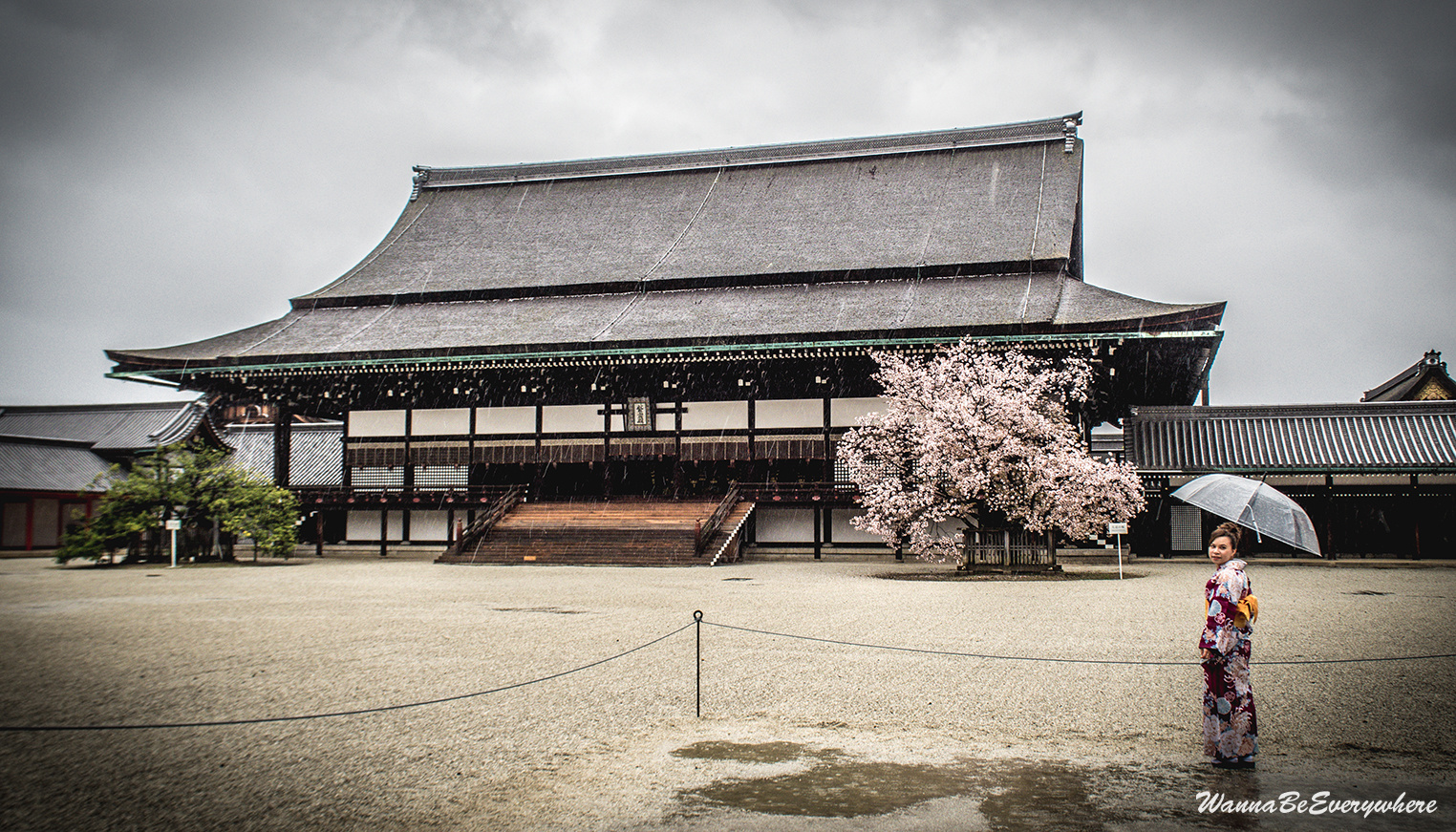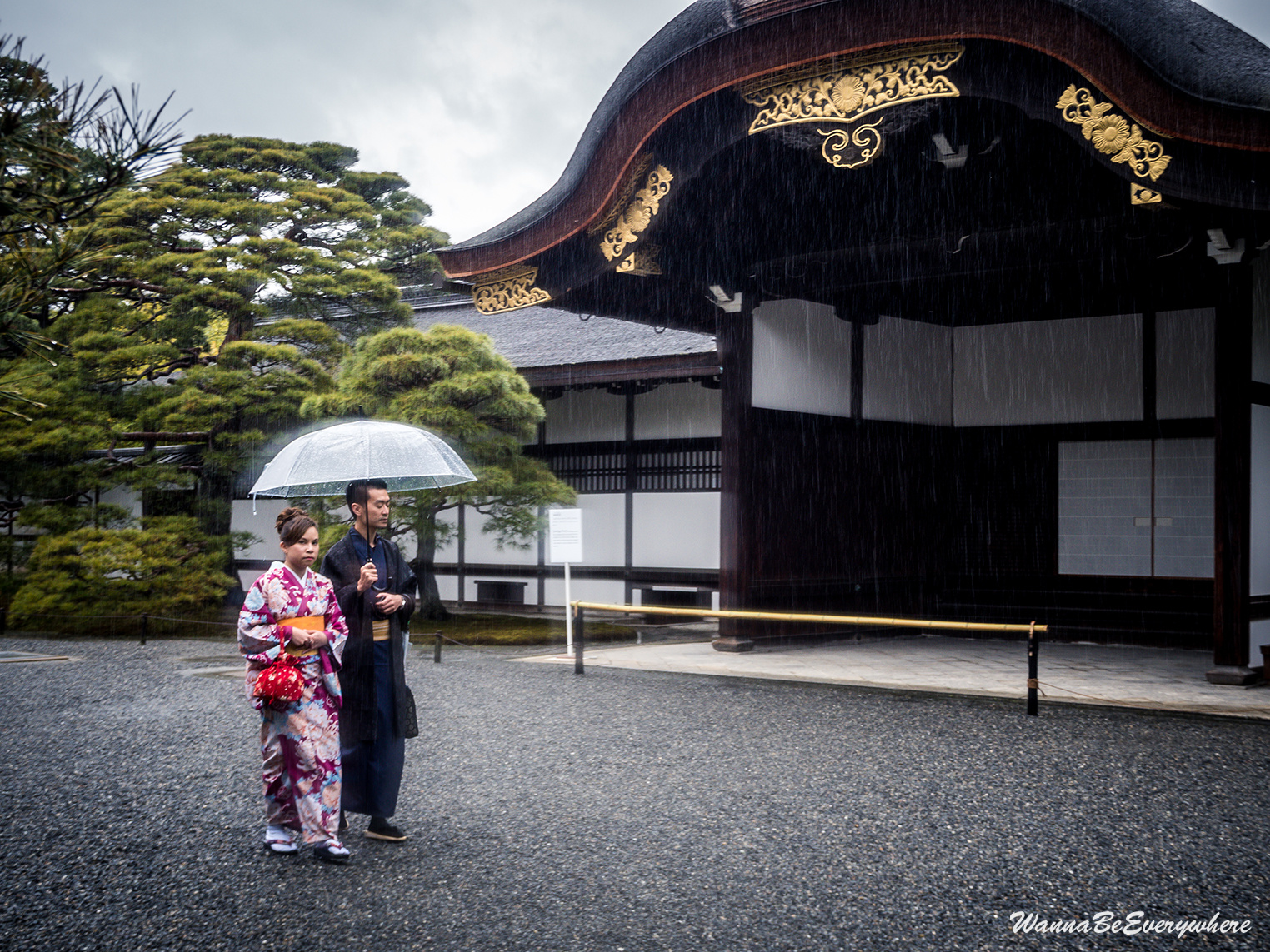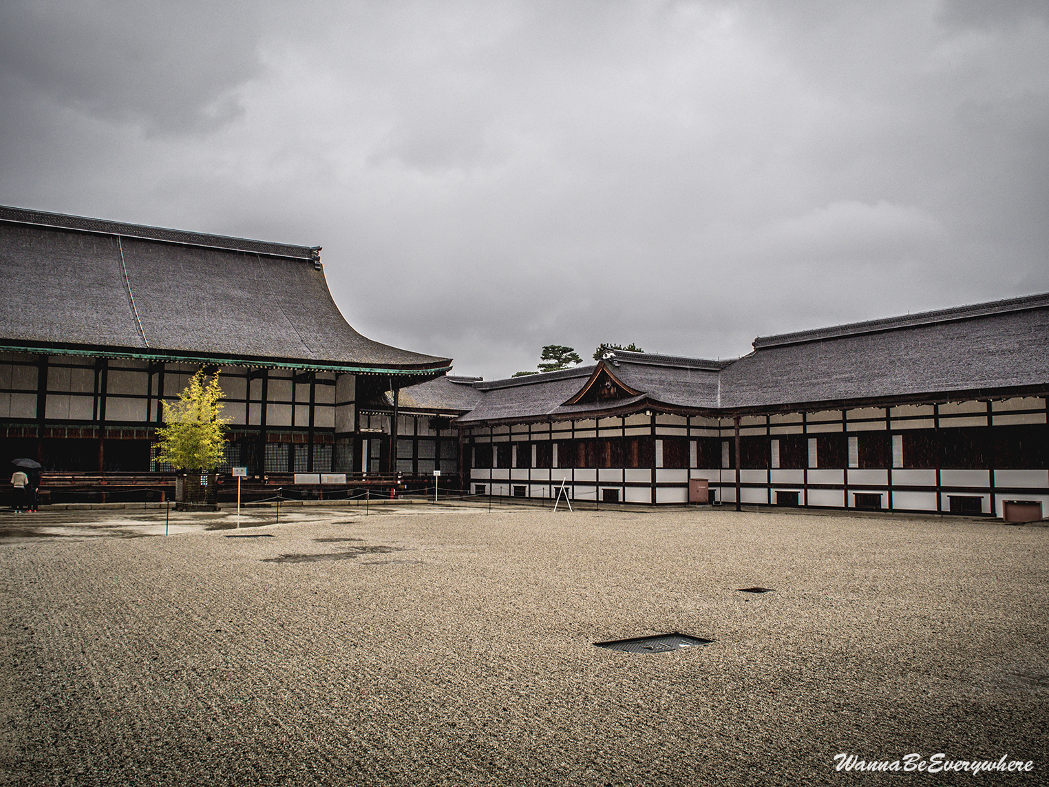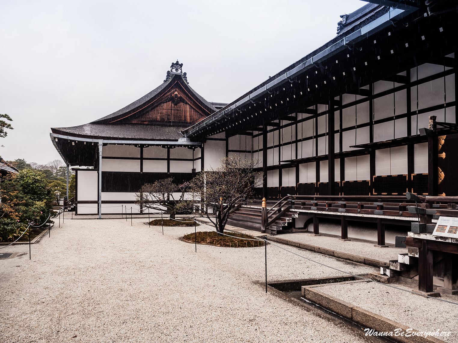 It used to be the residence of the Imperial Family until the capital was moved to Tokyo. It is located in the Kyōto Gyoen (Kyoto Imperial Park), which is a beautiful park to take a stroll. The park has a couple of other sights as well, like Sento Imperial Palace or a former residence of court nobles. So if you have time, definitely walk around. When I was there, I was unlucky, and before I reached the Imperial Palace, the only dry item on me was my shoes 🙂