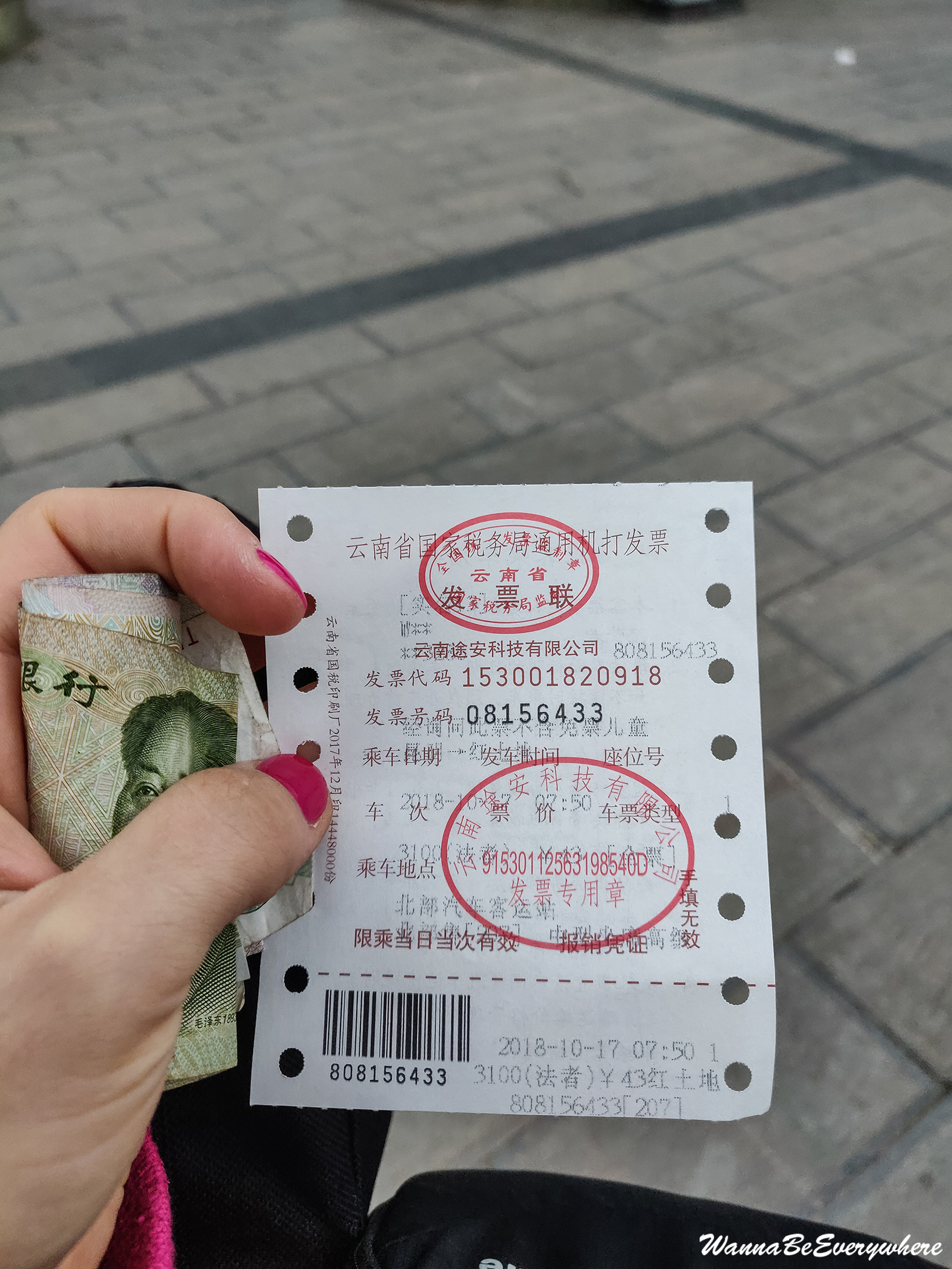 When I got to the cashier, I wrote on my phone that I want to get to Dongchuan and then showed her the picture of the fields. She gave me a ticket that stated that my bus leaves at 8:00, and that was the time of the bus departure I read on the internet, so I assumed that it might be a correct ticket 🙂