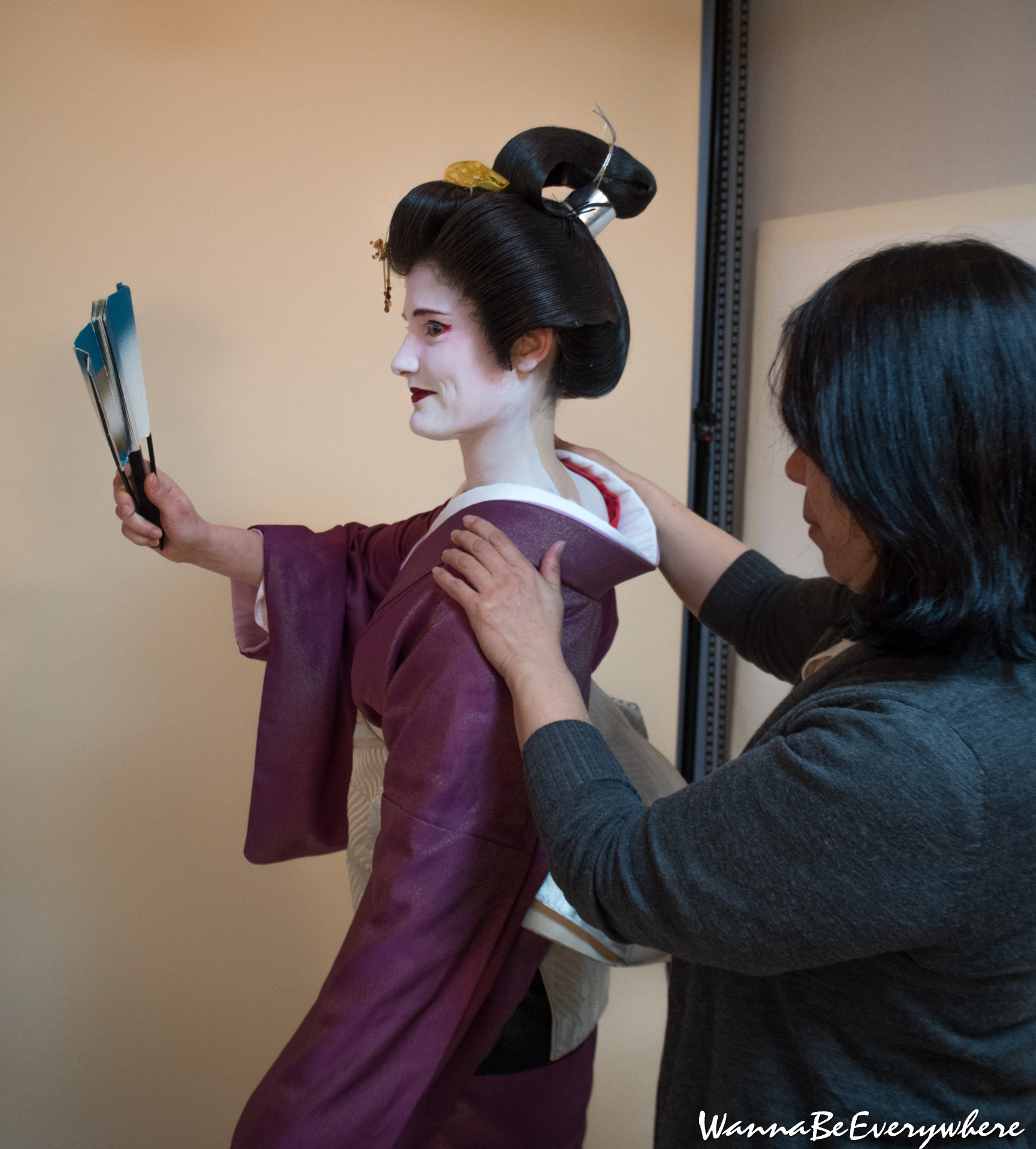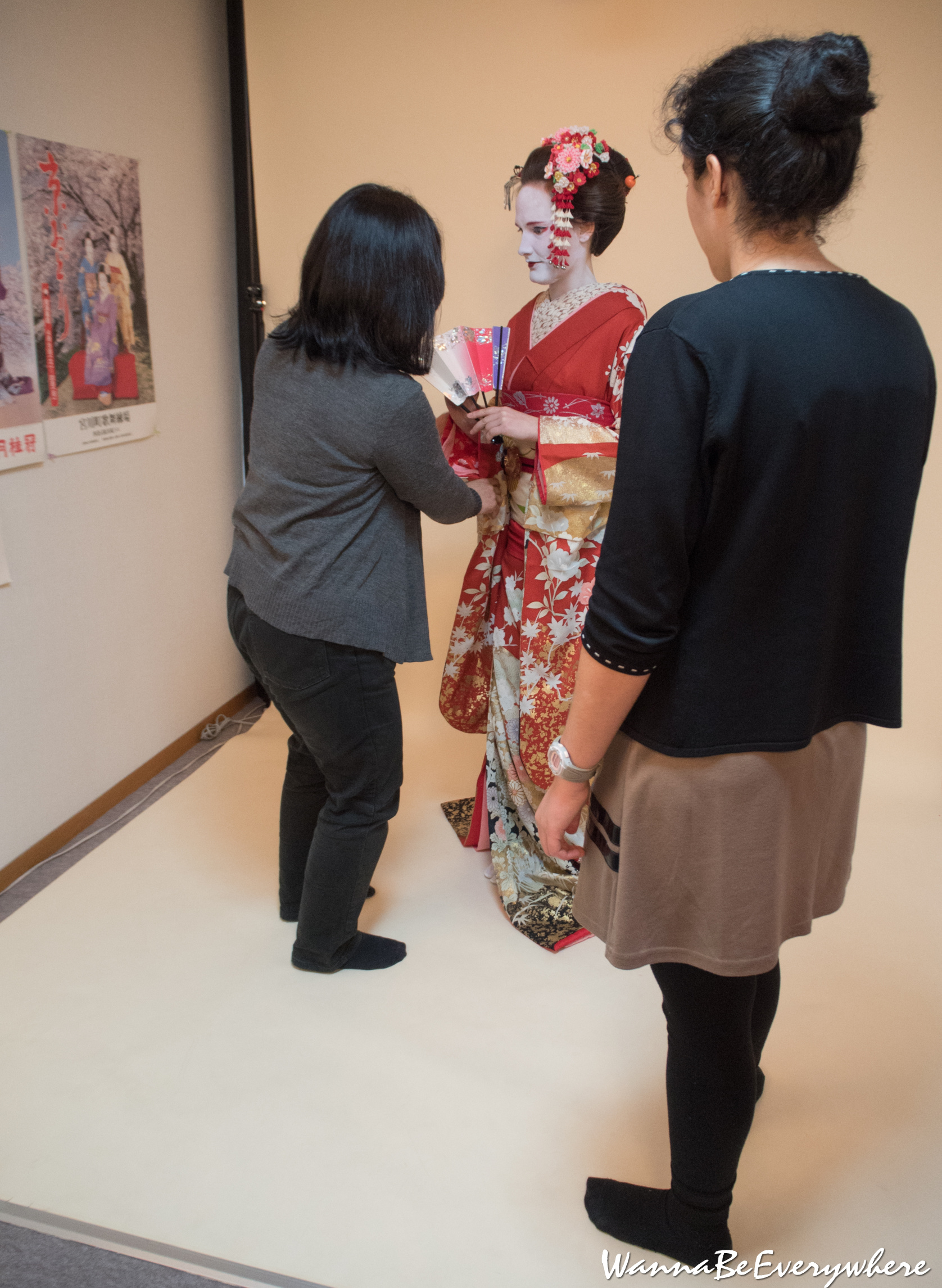 I have tried two outfits – for Maiko and Geiko. Maiko is a Geisha apprentice and is a young girl. Therefore her outfit is more youthful, full of colors and ornaments. Similarly, with makeup, which should look young and cute. On the other hand, Geiko is geisha (in the Kyoto dialect). She is a professional artist who excels in traditional Japanese arts and crafts such as shamisen playing, dancing, and tea ceremony. Her outfit is less colorful and looks more serious. If you want to know more about the differences between the two, check out this article.