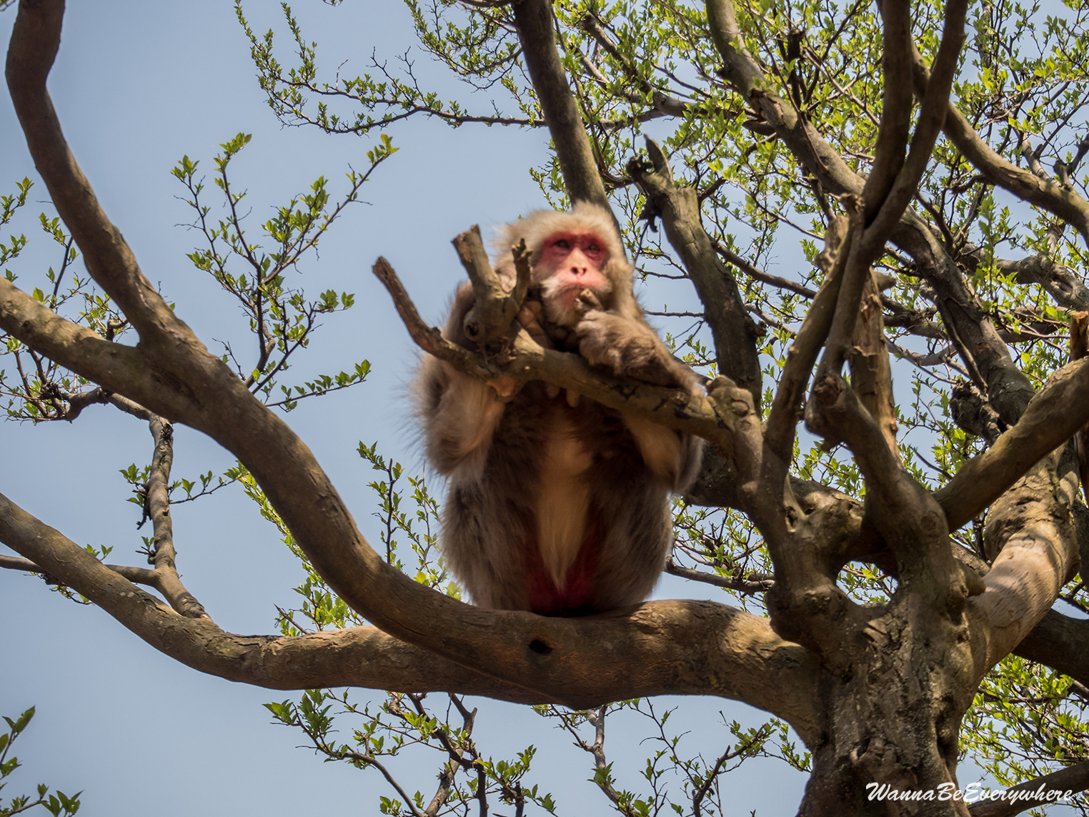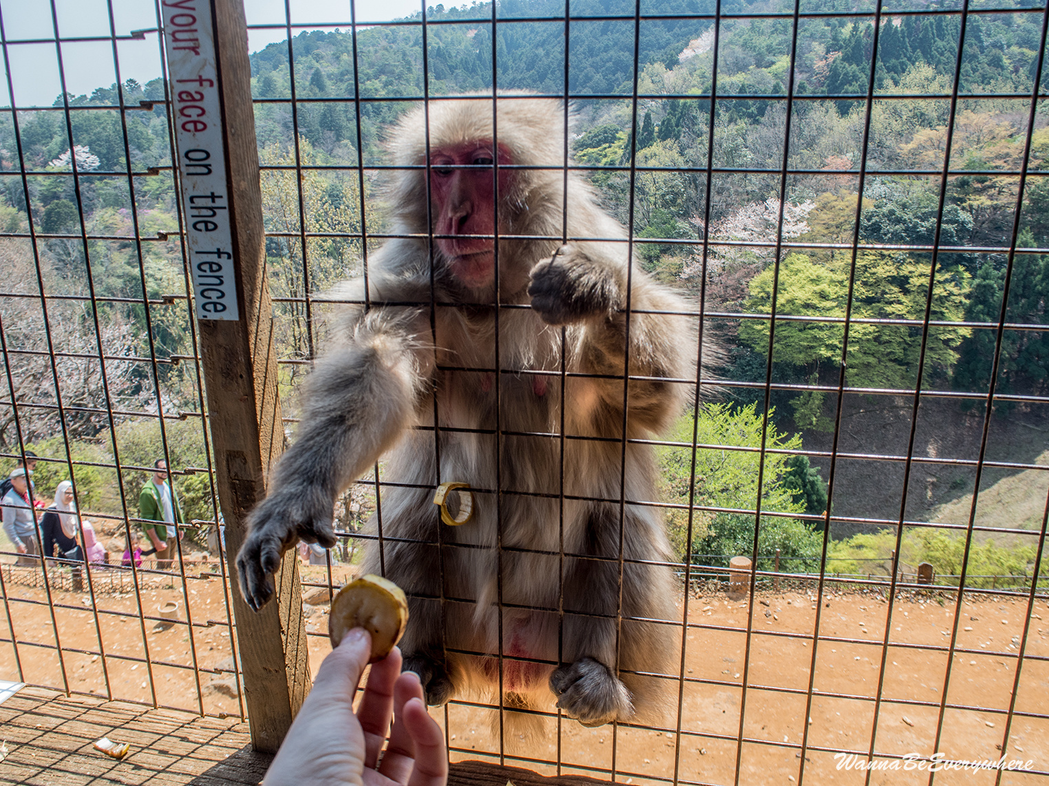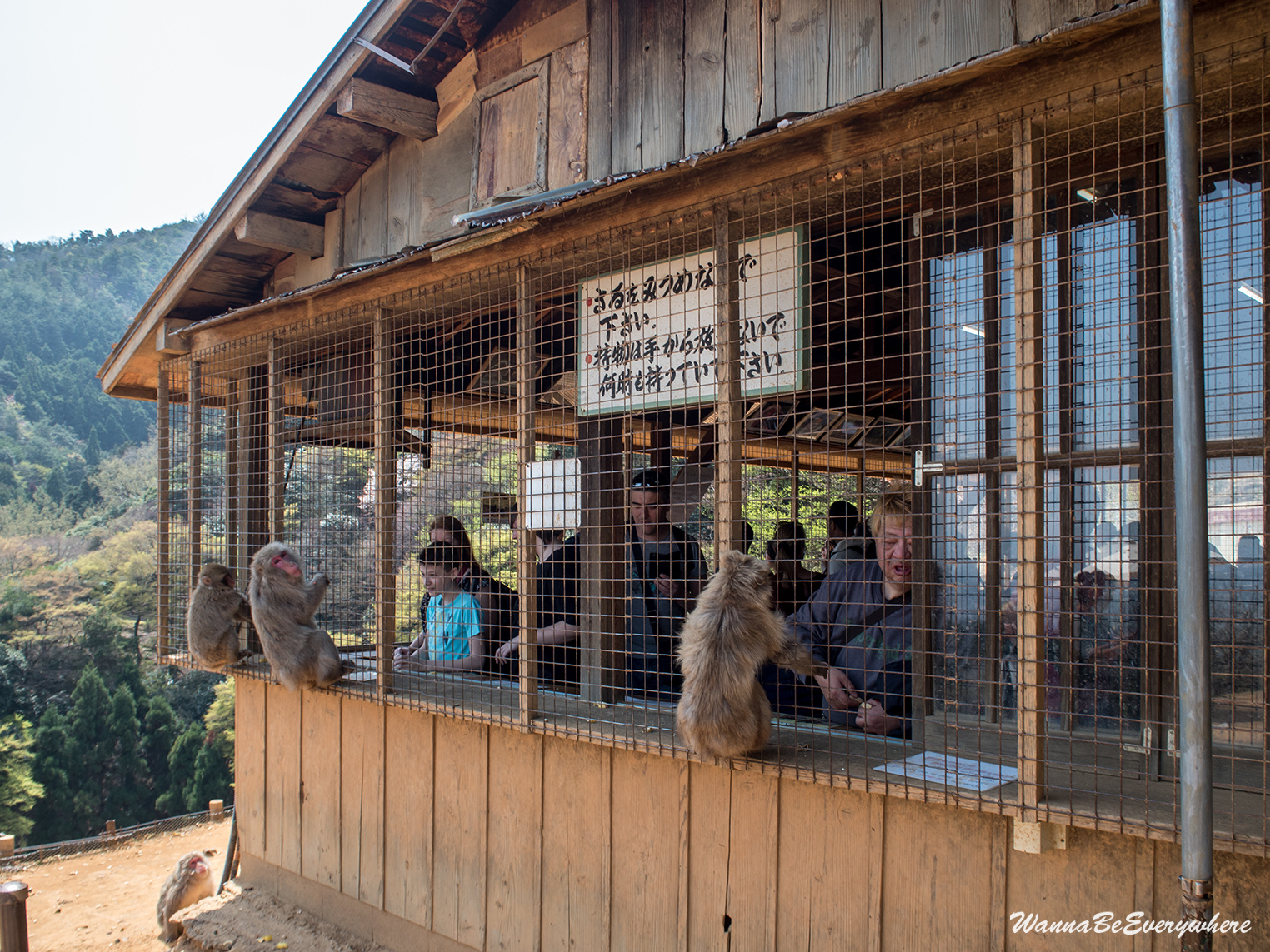 Monkey park was one of the places I wanted to see while in Japan. The park is located on a mountainside, and it takes only around 20 minutes to hike up the hill. On top, you can see a lot of Japanese macaques – snow monkeys. They roam freely in the park, but they are not domesticated. Many signs are saying that you should not stare at them or feed them as they might attack. There is a special hut, where visitors can go into and buy some peanuts or bananas and then feed them to the monkeys through the bars. But it is important to remember that those are wild animals, not pets.
