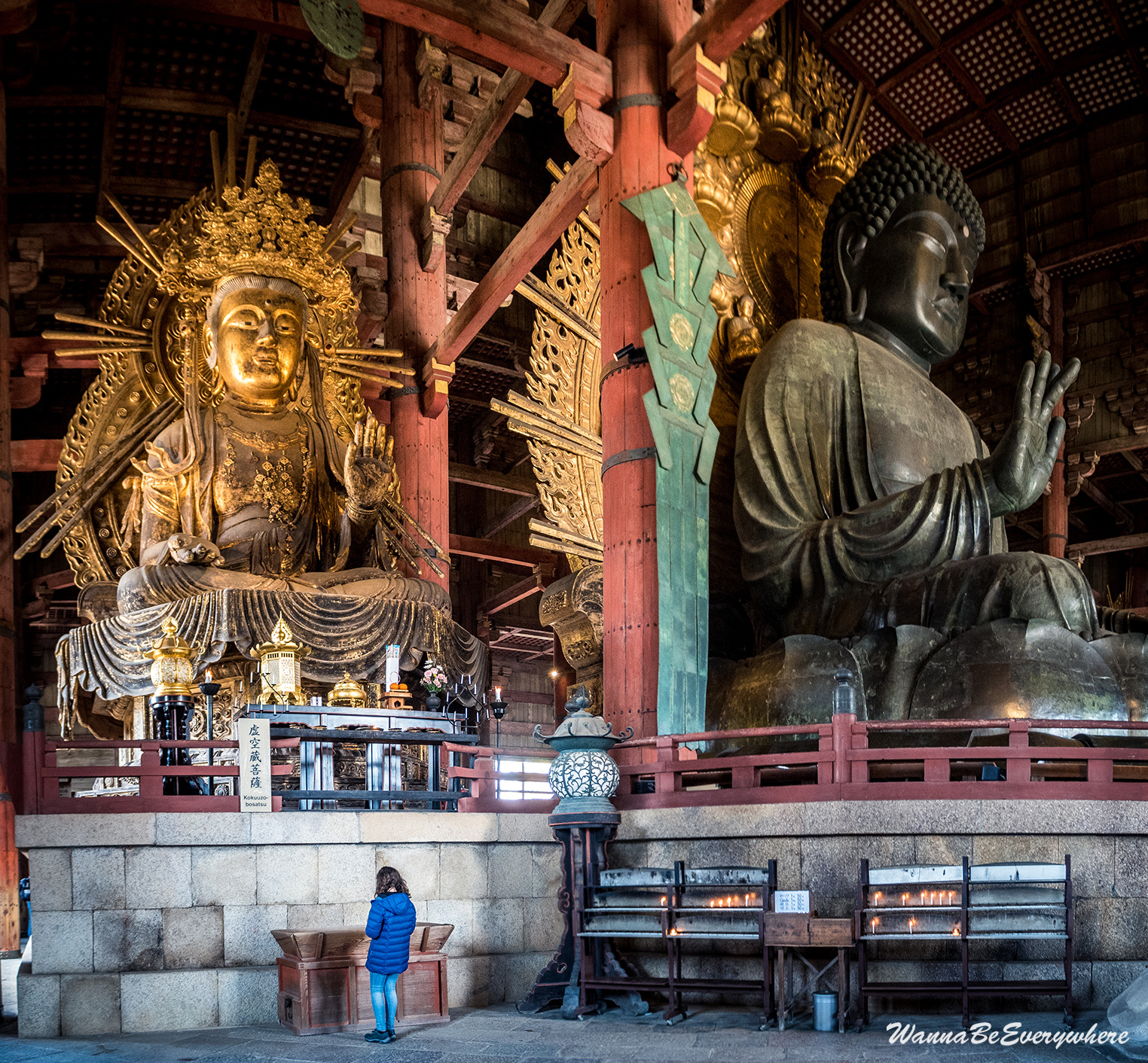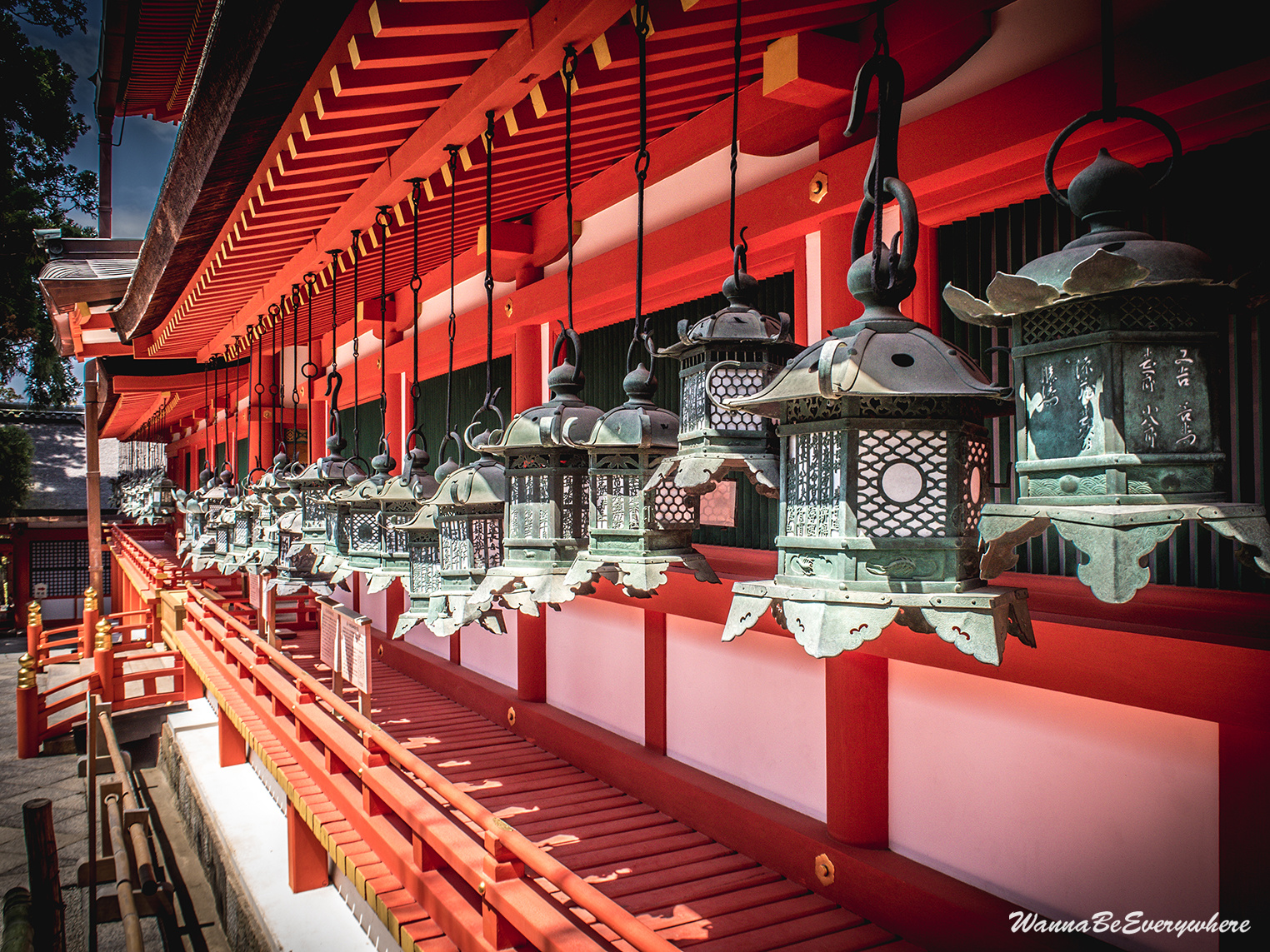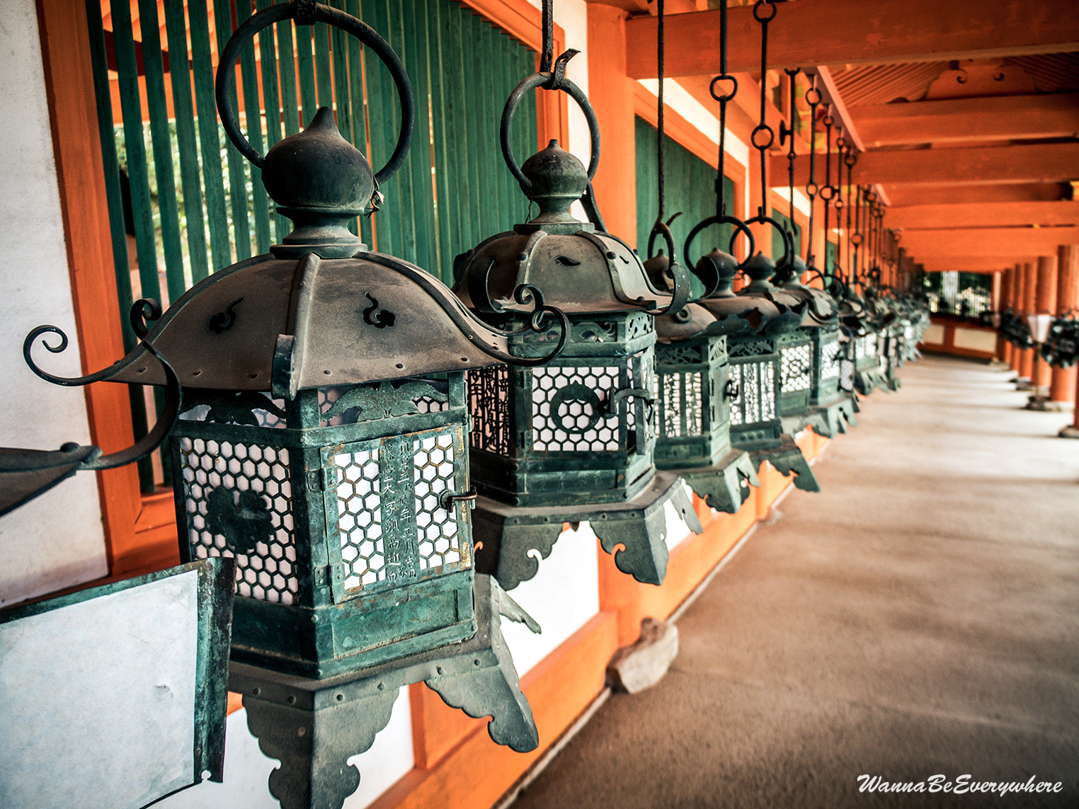 A small hike up the hill will reward you with this impressive shrine. Kasuga – Taisha is known for hundreds of lanterns donated by worshipers. Already while approaching the shrine through the forest, I was surrounded by many stone lanterns. And cute deers, trying to get the cookies from me 🙂 Upon entering the grounds, I was blown away. I discovered hundreds of bronze laters all around, surrounding the temple grounds. It was such a great sight for pictures!!